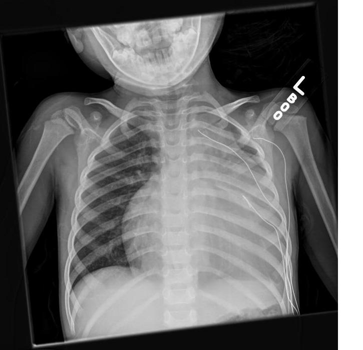 HPI: Two year old male with developmental delay was referred by his PCP to evaluate cardiomegaly on CXR. The patient presented to the pediatrician with 4 days of cough and fever and crackles on exam. The CXR is shown below: