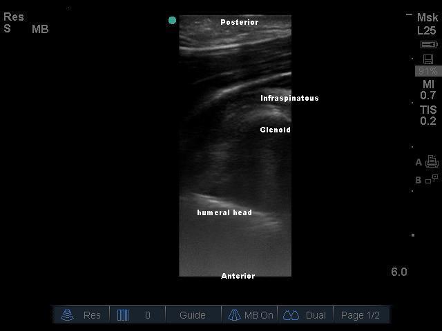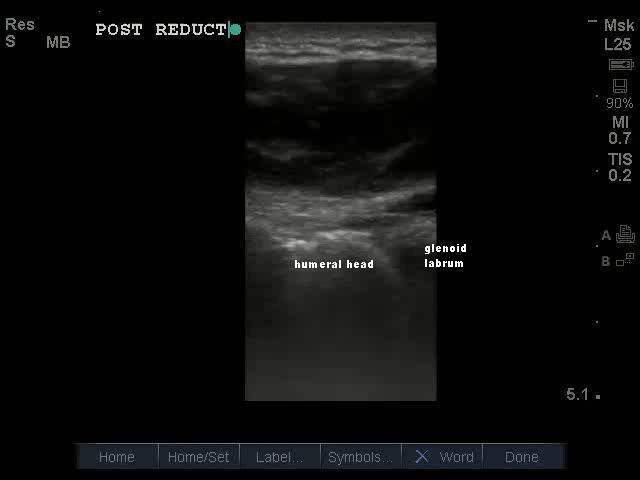See labeled ultrasound images of a dislocated shoulder above (still images courtesy of Kristen Breslin and Jo Cohen) and compare it to a normal shoulder. Note the distance between the humerus and glenoid fossa.